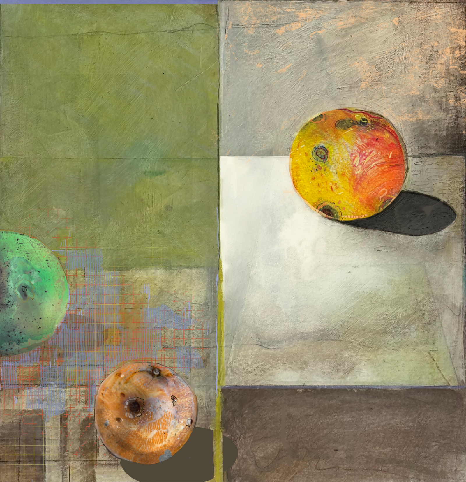 “As a pictorial genre I have until recently avoided creating still-life, perhaps mistakenly thinking it was too easy a genre. Then I began studying the 1600 century works by the Spanish artist Juan Sánchez Cotán, and these paintings were a revelation to me. I approached them not as realistic renderings, but as complex abstract compositions. The spareness of his design and the minimal space was unmistakably modern to me. Though his melons and vegetables exist in isolation on a black field they are engaged in a visual conversation with each other that invites the viewer to look deeper and contemplate these relationships. It is precisely this interplay between and among the damaged fruits in my works that evoke the inevitable processes of time and the unfolding awareness of climate change affecting our shared future.