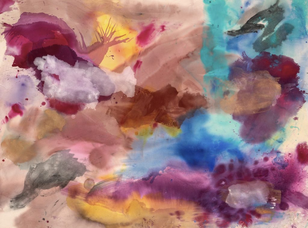 “States of discovery are awkward and exhilarating and vital. Horsing around with fluidity and air, I came upon these expressions. These new paintings trace the feeling of standing inside color and space – where energy, light, and memory converge.”