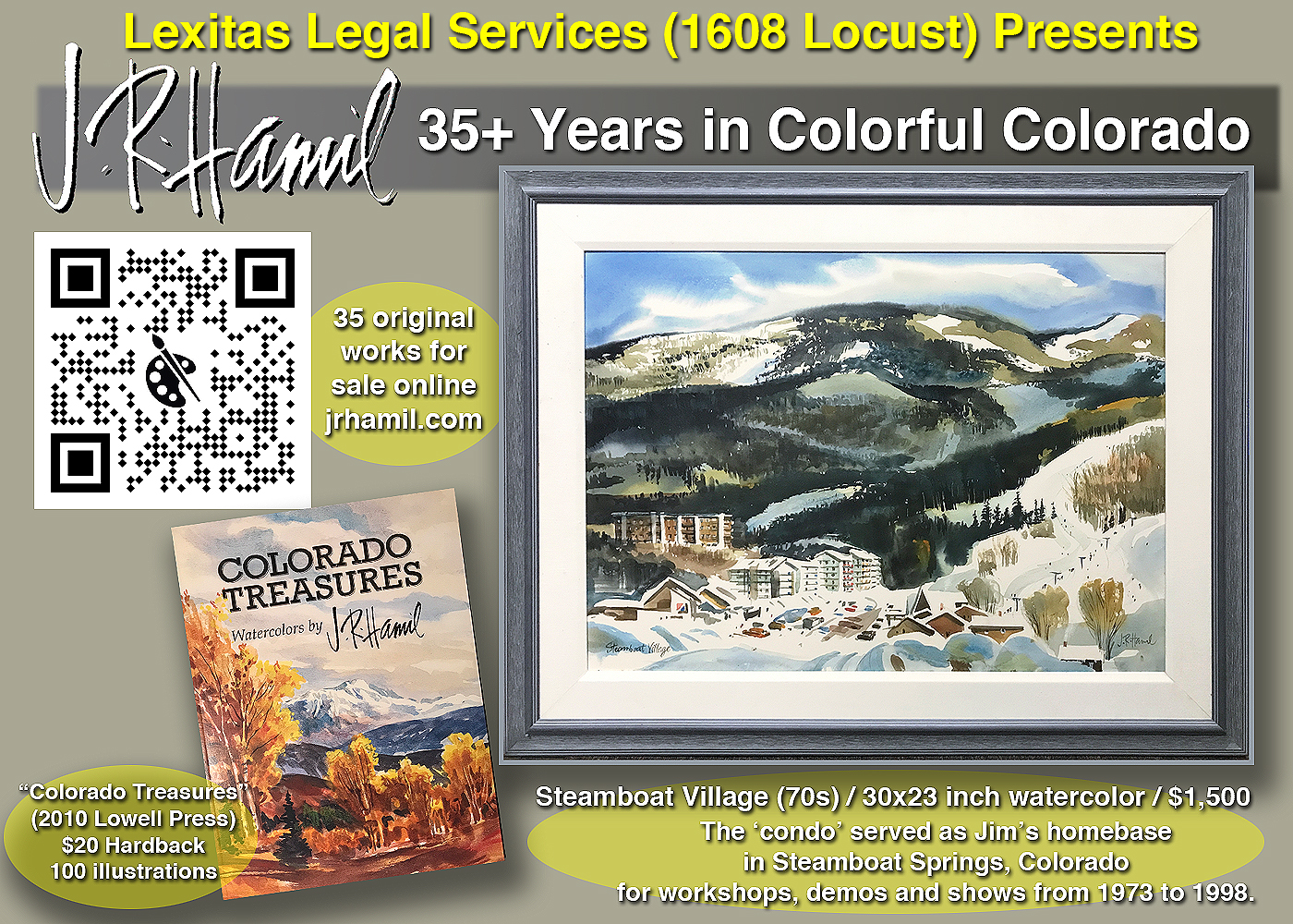 Join Us as Lexitas KC presents J.R. Hamil’s Colorado Treasures for the August First Friday in the Crossroads on August 2nd, 5pm to 8pm, 1608 Locust Street, KCMO. J.R. Hamil’s original works created between 1973 to 1998. This is a show you don’t want to miss. To learn more about this American Watercolor Artist, use the QRCode.