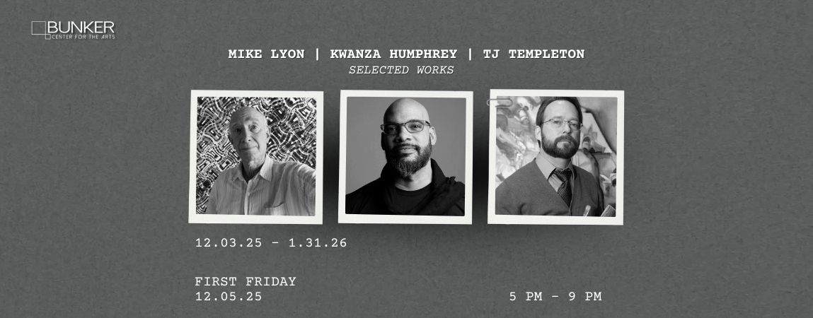 Come join us for the last First Friday of 2025 at the Bunker Center for the Arts with the opening reception of Mike Lyon | Kwanza Humphrey | TJ Templeton : Selected Works. There’s free parking, light refreshments, and a chance to meet the artists.