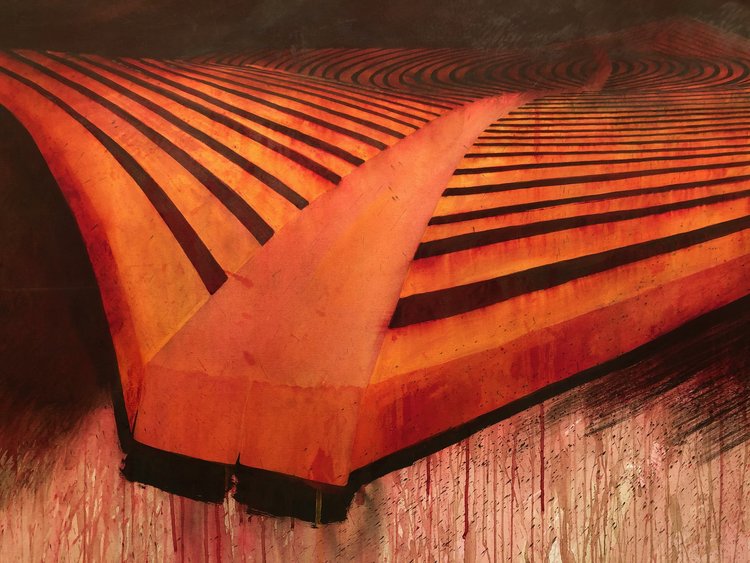 His two-dimensional artwork often documents large-scale outdoor sculptures that were created with his students and volunteers. Many of them were of a scale where visitors could enter and pass through the installations. Often A‑frame wooden structures, the sculptures were literal passageways through art. Frequent imagery in Stackhouse’s output includes boats and ships (reflecting earthly and spiritual passages) and snakes (symbolic of regeneration and death). He was also especially intrigued with the process of a snake shedding its skin and slithering away afresh.
